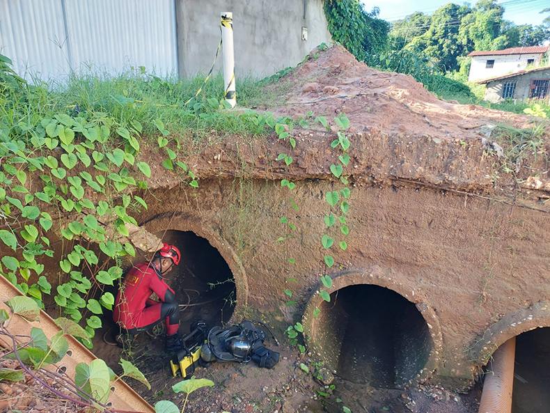 As buscas começaram ainda na noite de terça-feira (17) e foram retomadas na manhã desta quarta-feira (18) em uma galeria conectada ao bueiro.