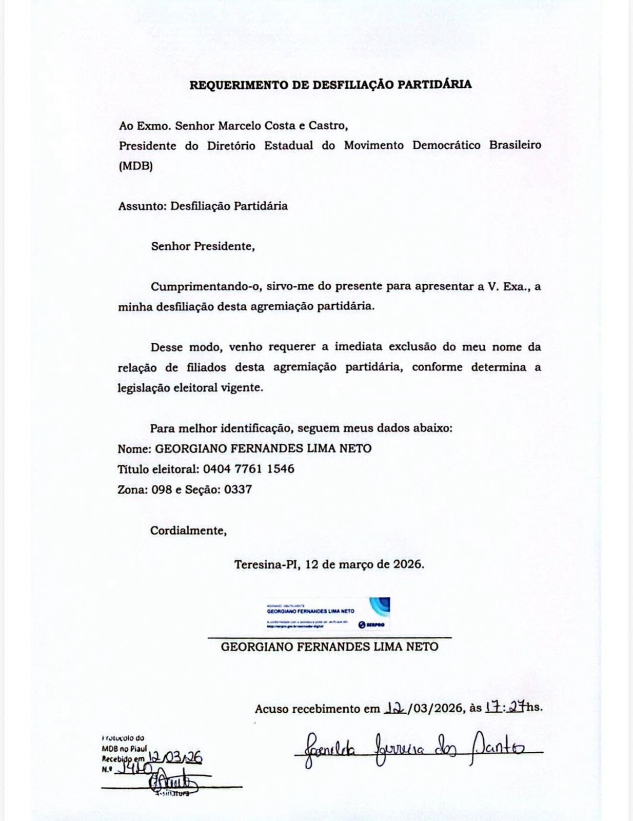 Na publicação feita nas redes sociais, Georgiano informou que já solicitou a desfiliação e que deverá anunciar em breve uma nova filiação partidária com foco nas eleições de 2026.